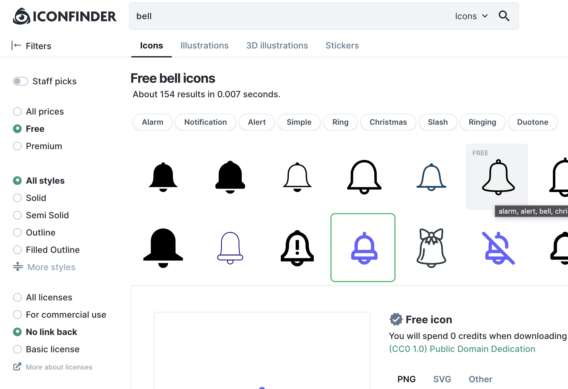 ICONFINDER에서 좌측 검색 옵션에 Free, No link back 을 설정해서 검색한다.