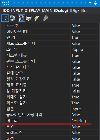 리소스 설정에서 border(테두리)의 속성을 Resizing으로 설정하면 윈도우 창 크기를 마우스로 조절이 가능하게 된다.