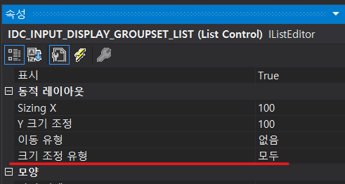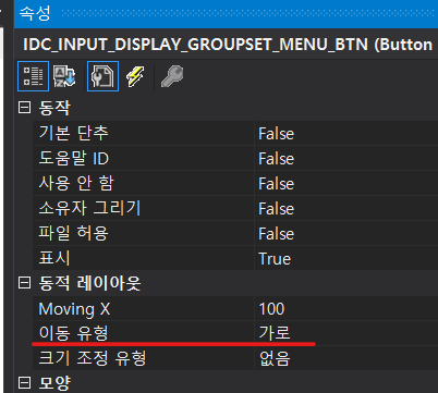 창 비율에 맞춰서 컨트롤 윈도우의 위치도 함께 이동할 수 있도록 한다. 리소스 수정에서 이동유형 속성을 변경하면된다. '가로, 세로, 없음, 모두'를 선택할 수있다.