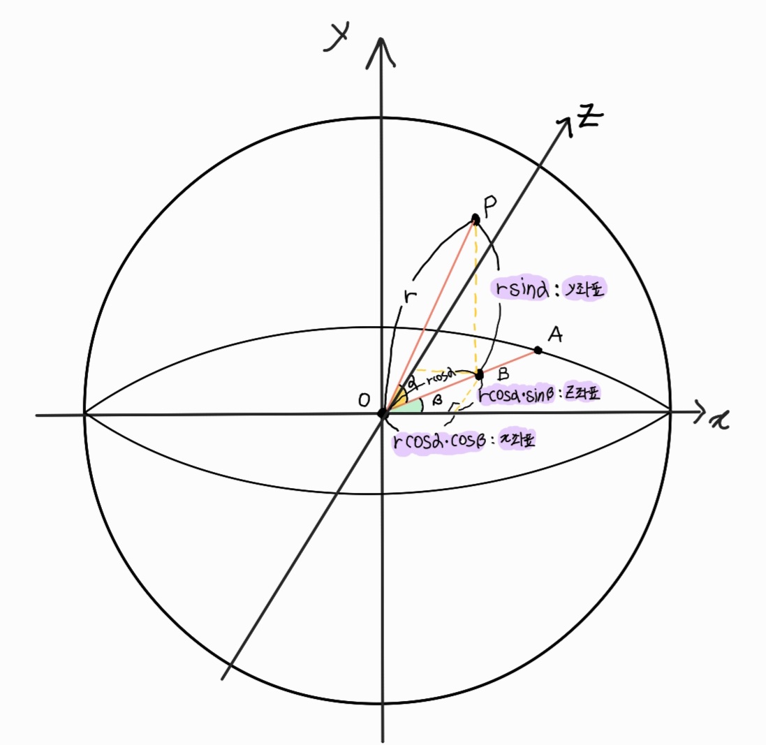 α : y 회전 값, β : x 회전 값 이라고 했을 때 점P의 좌표값은 P (d cosα cosβ, d sinα, d cosα sinβ) 이다.
